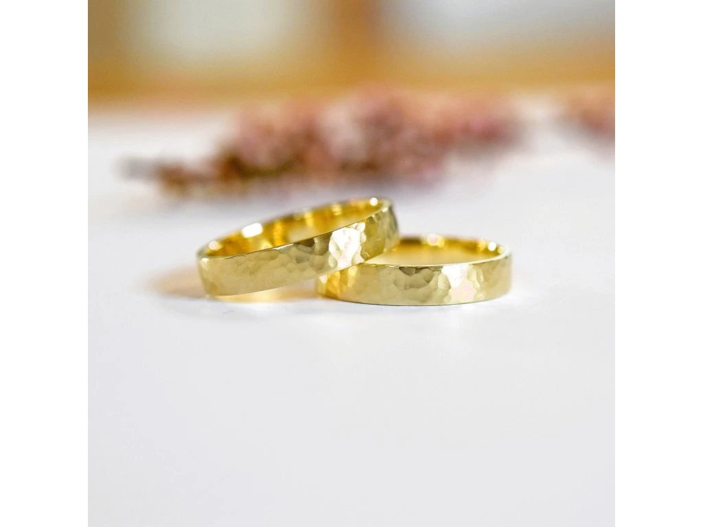 Svadobné obrúčky s tepaným matným povrchom, ktorý velmi decentne odráža svetlo. Obrúčka má tepaný povrch vytvorený kladivom. Kedže je povrch členitý krásne odráža svetlo, a jeho výhodou je že tu zaniknú jemné škrabančeky ktoré vzniknú nosením obrúčky.
