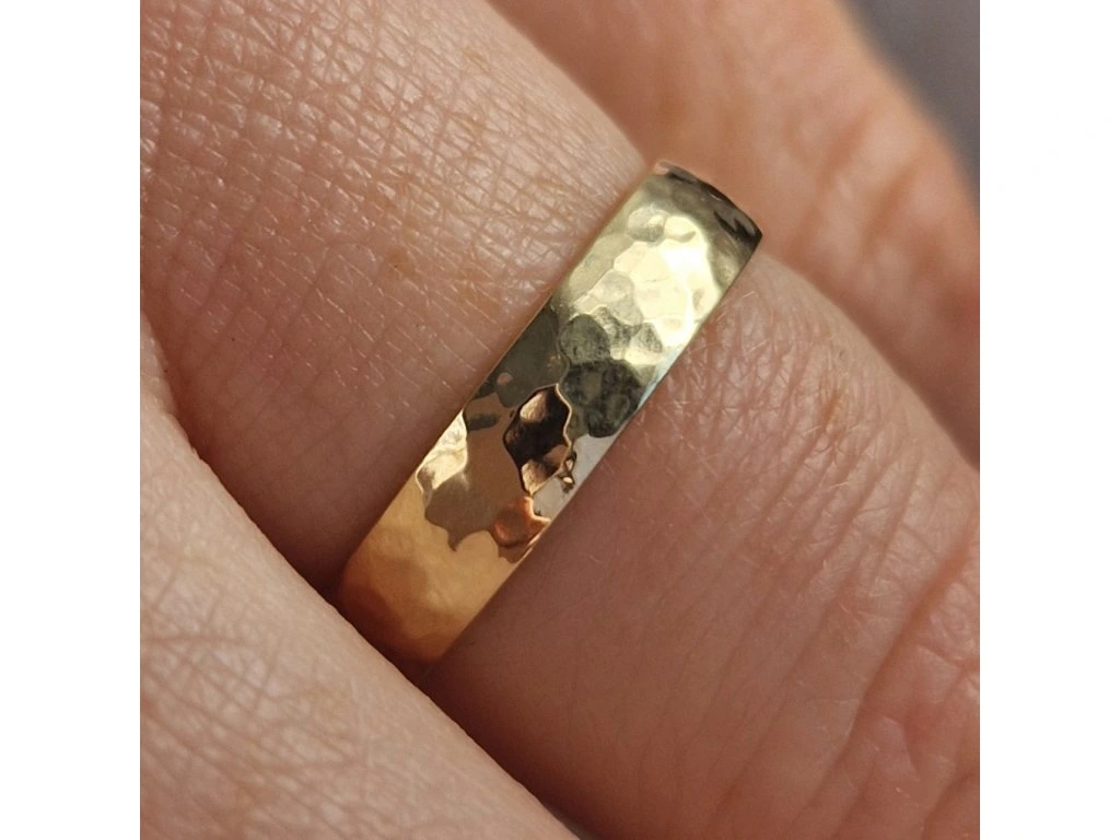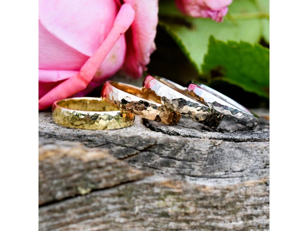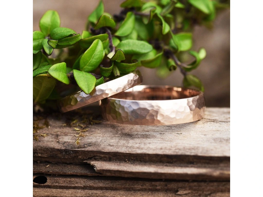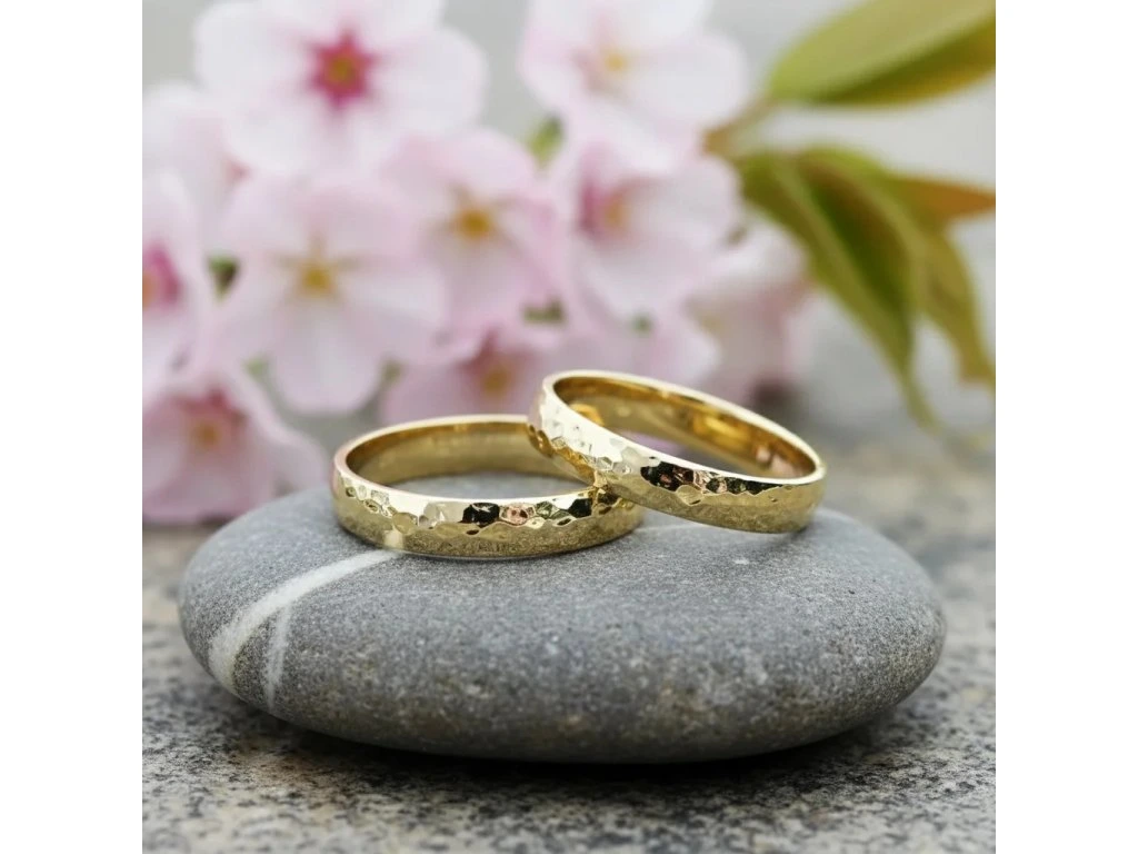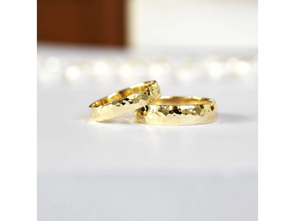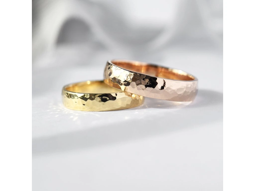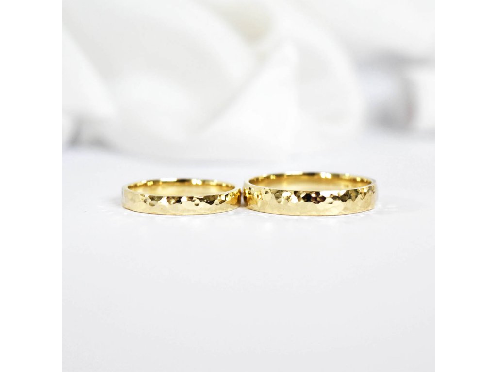 Minimalistické svadobné obrúčky, vyrobené zo 14 karátového zlata. Obrúčka má tepaný povrch vytvorený kladivom. Keďže je povrch členitý krásne odráža svetlo, a jeho výhodou je že tu zaniknú jemné škrabačky ktoré vzniknú nosením obrúčky.