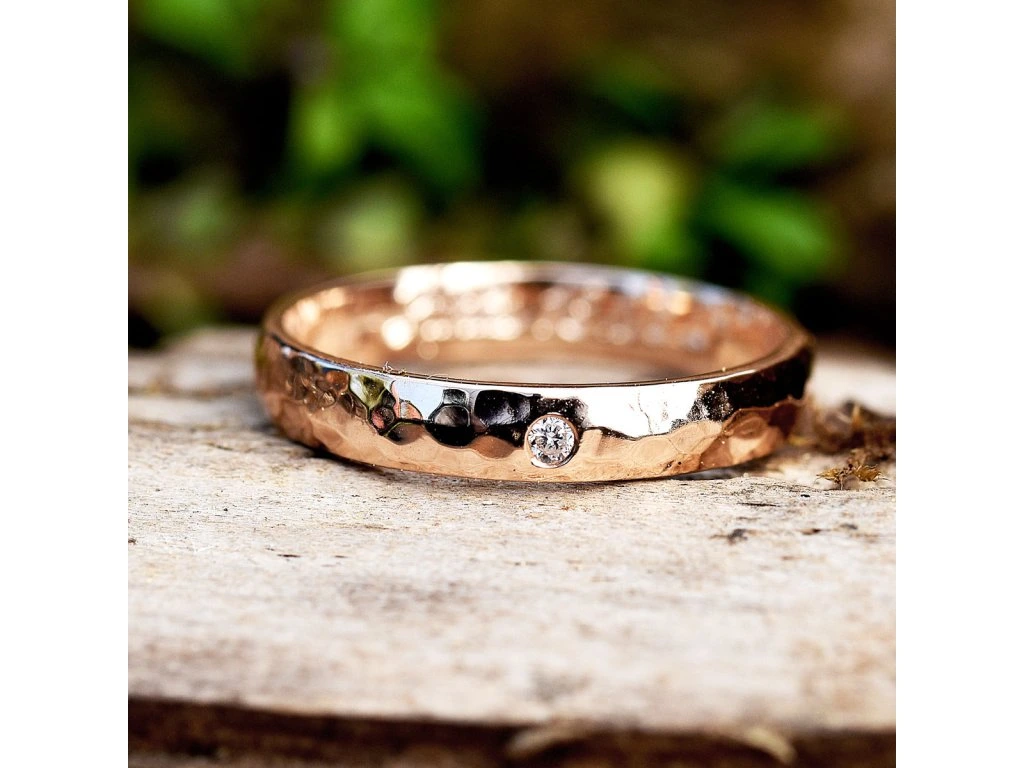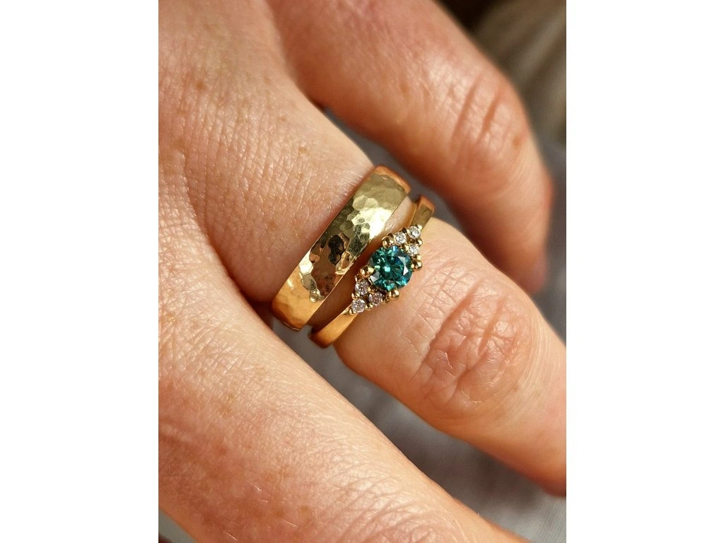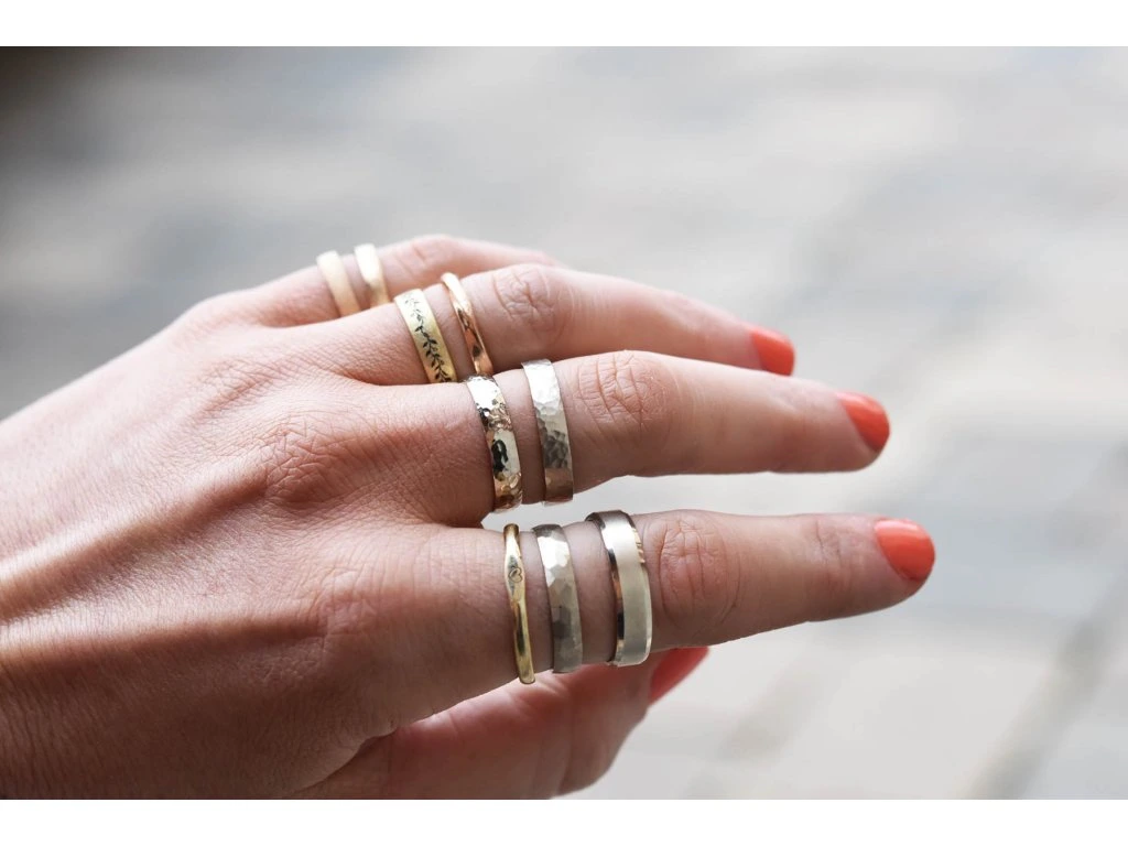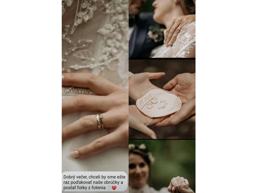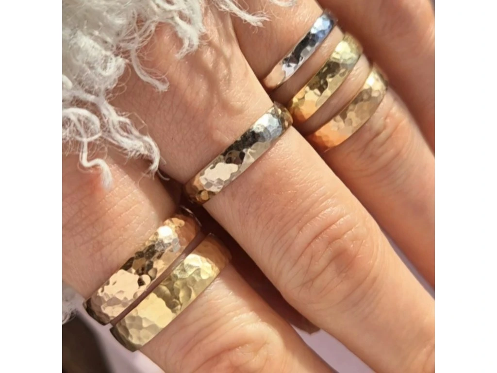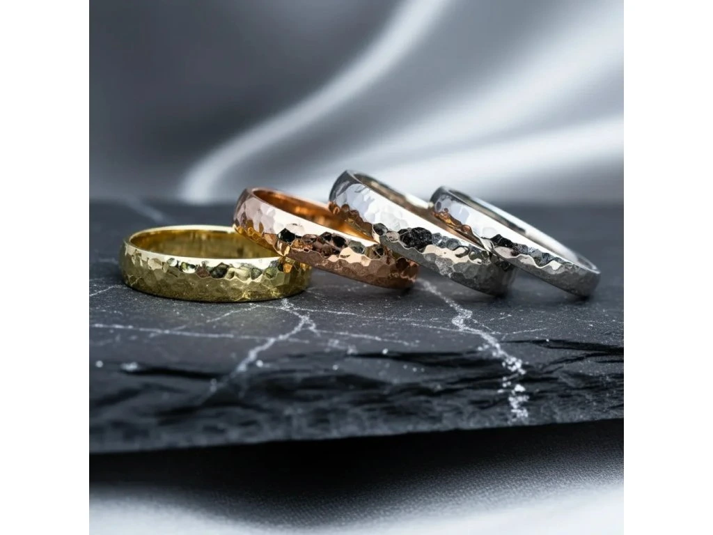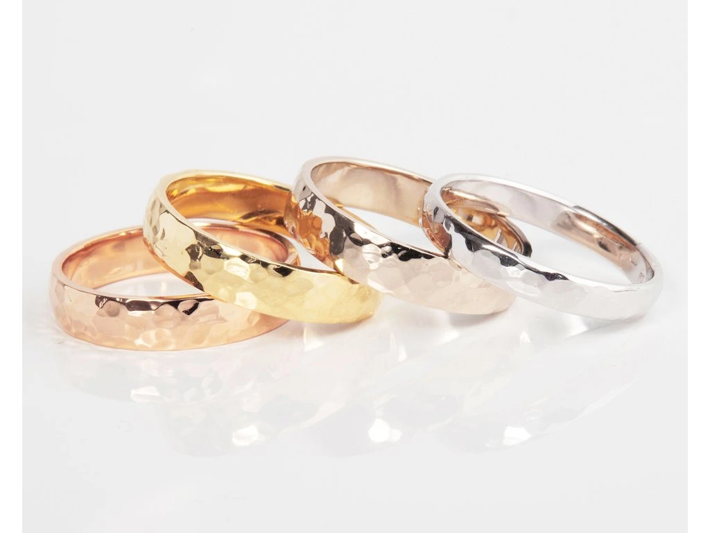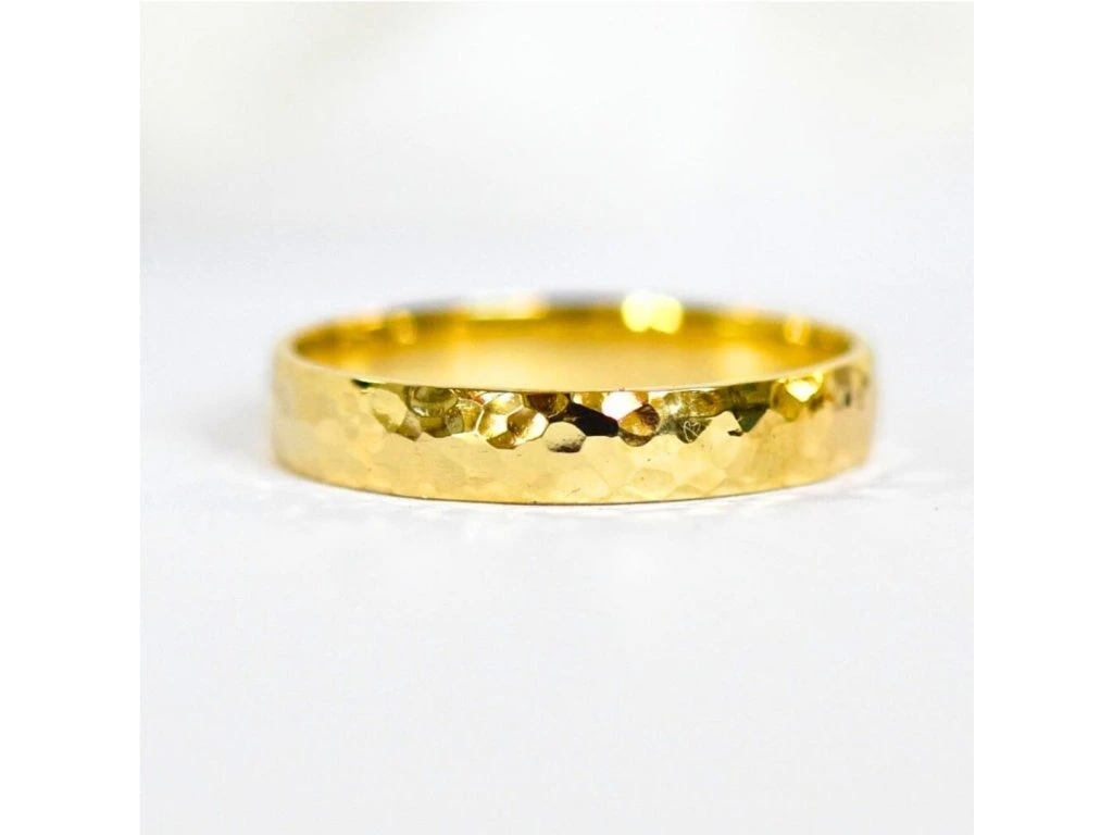 Minimalistické svadobné obrúčky, vyrobené zo 14 karátového zlata. Obrúčka má tepaný povrch vytvorený kladivom. Keďže je povrch členitý krásne odráža svetlo, a jeho výhodou je že tu zaniknú jemné škrabačky ktoré vzniknú nosením obrúčky.