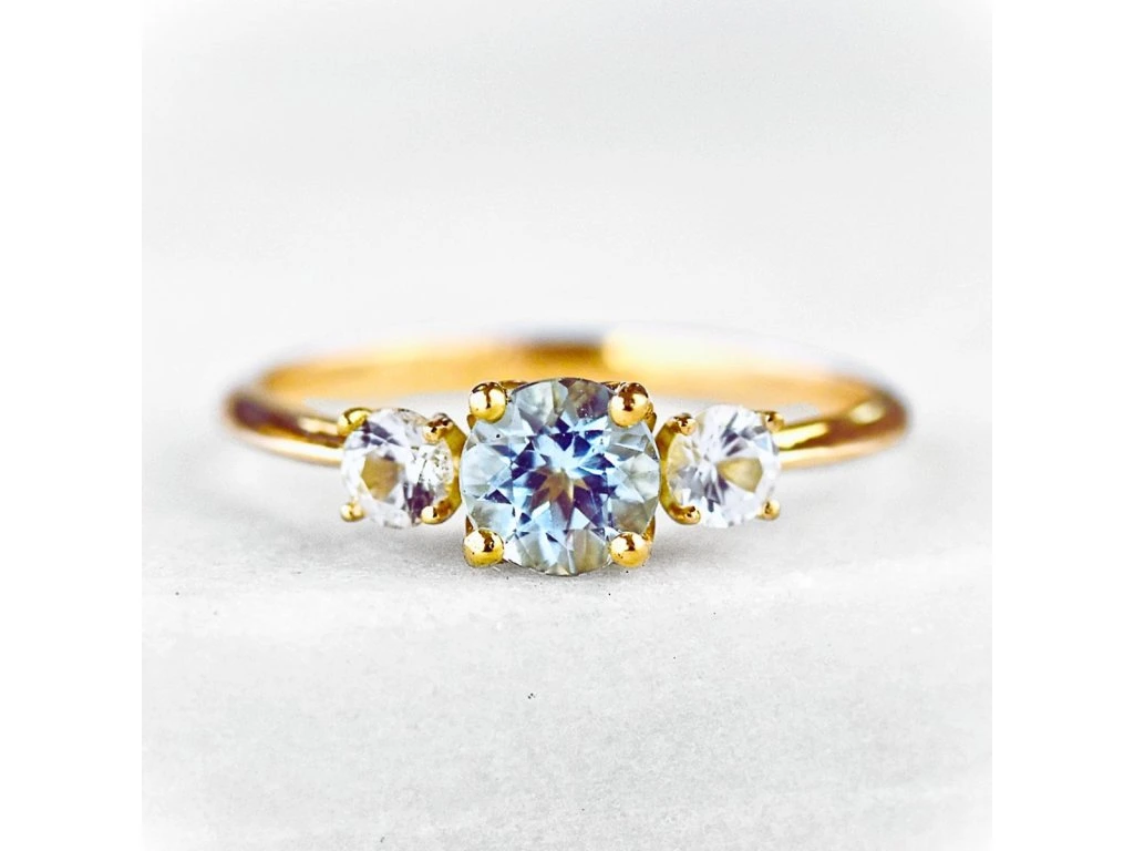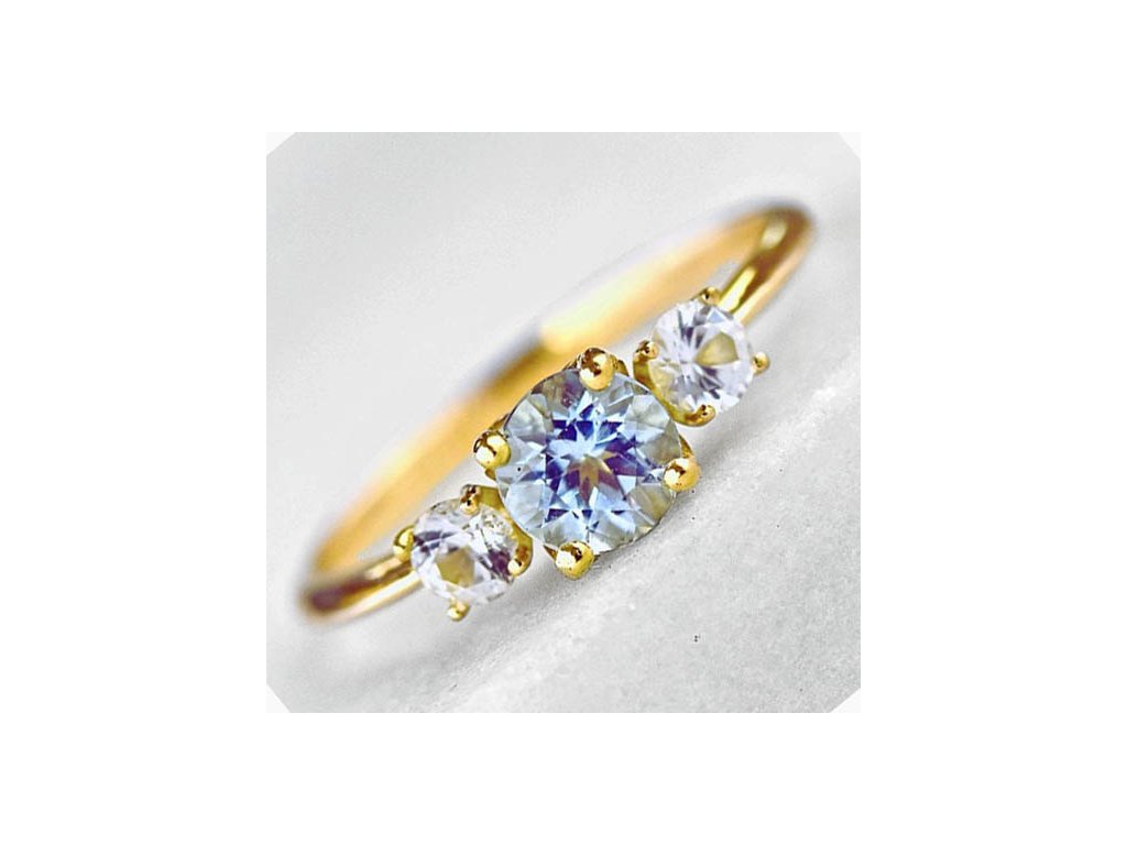 Zlatý prsteň vhodný ako snubný prsteň s Akvamarínom 5mm a dvomi bielymi zafírmi 3mm.