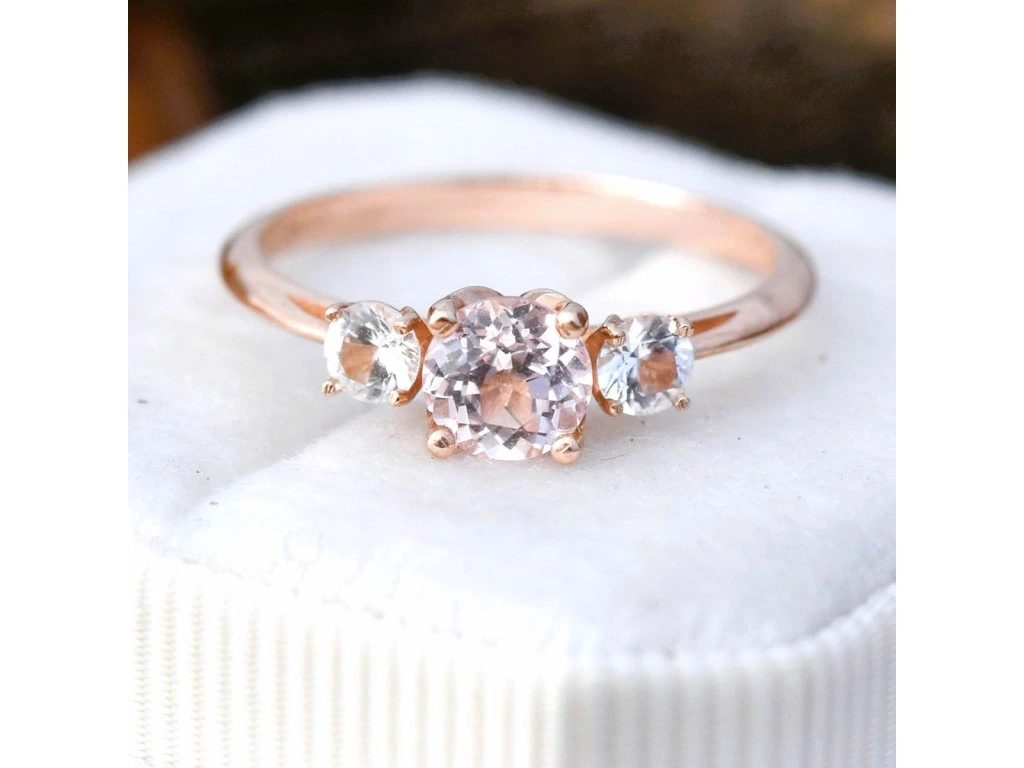 Stredový kameň je ružový zafír veľkosti 5mm, po stranách sú biele zafíry veľkosti 3,5mm.
