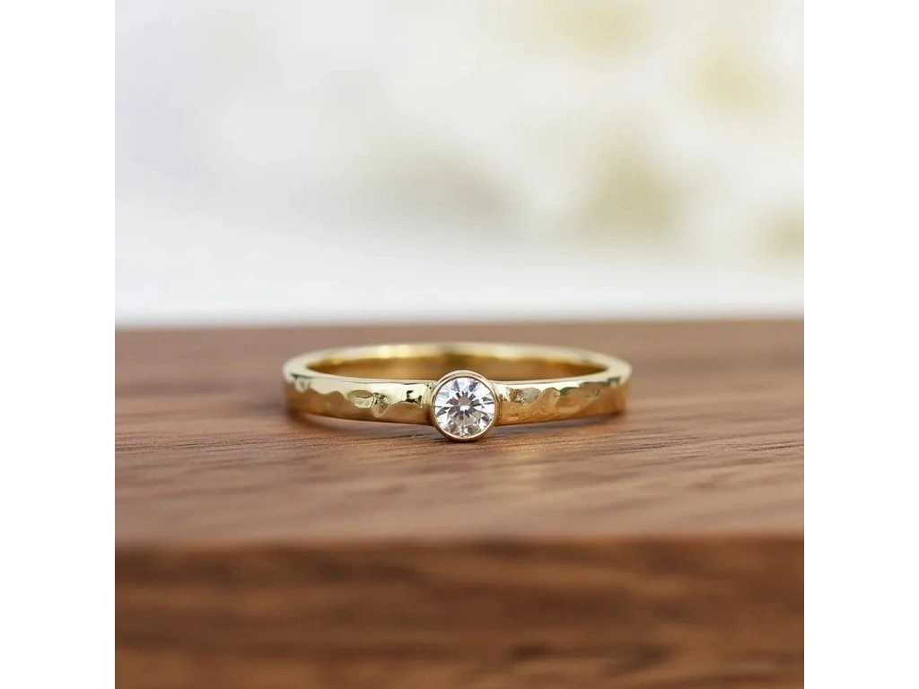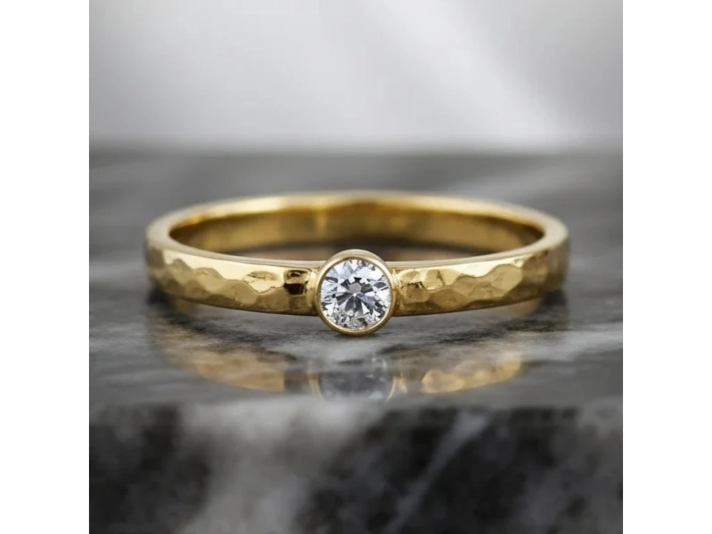 Zlatý tepaný prsteň s diamantom.