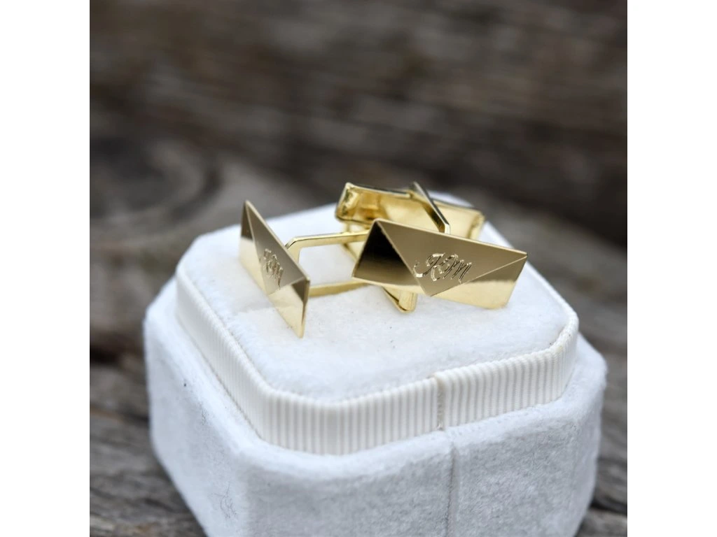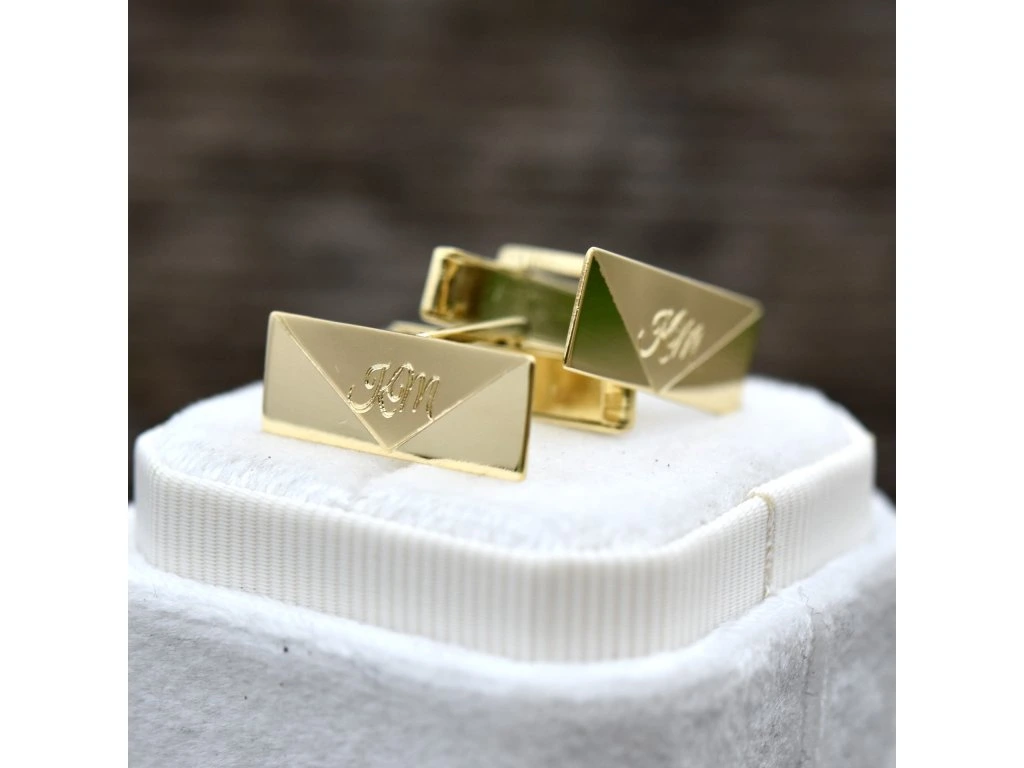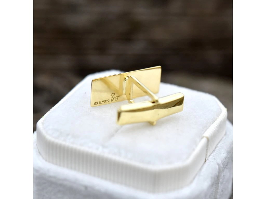 Zlaté manžetové gombíky s vyrytým monogramom.