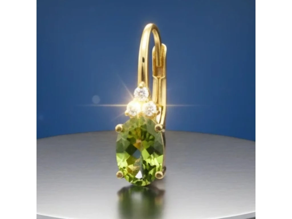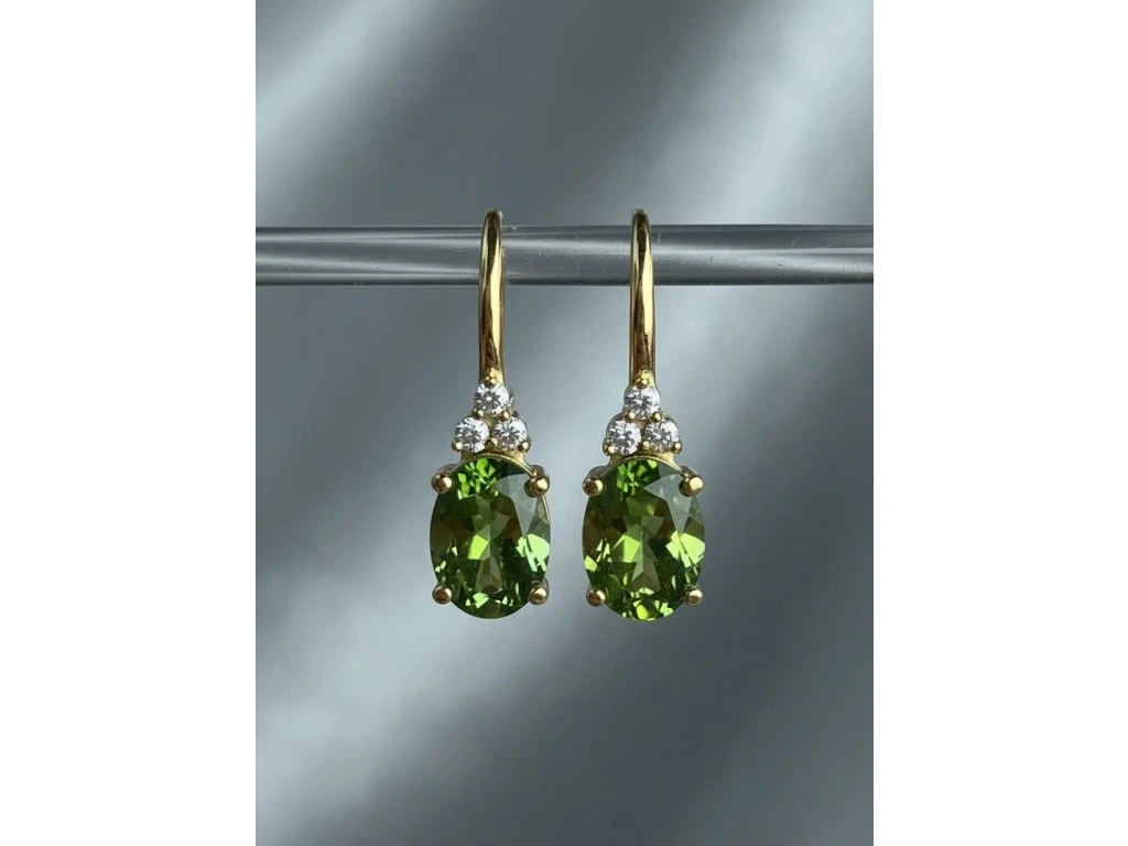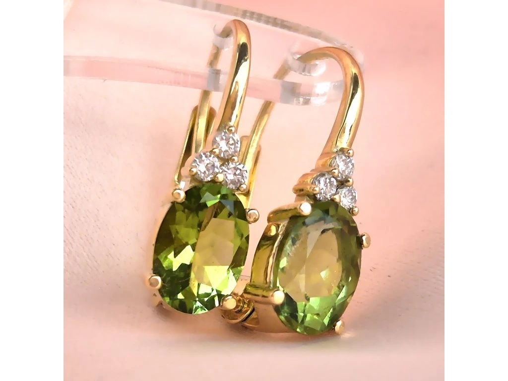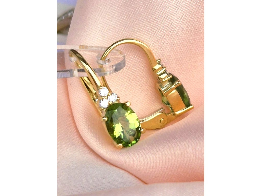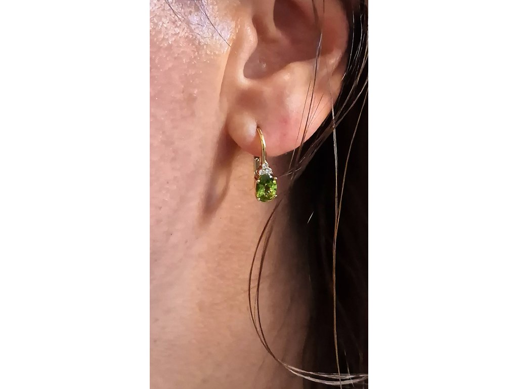 Zlaté náušničky s drahokamom Turmalín veľkosti 7x5mm. a diamantami 1,5mm.