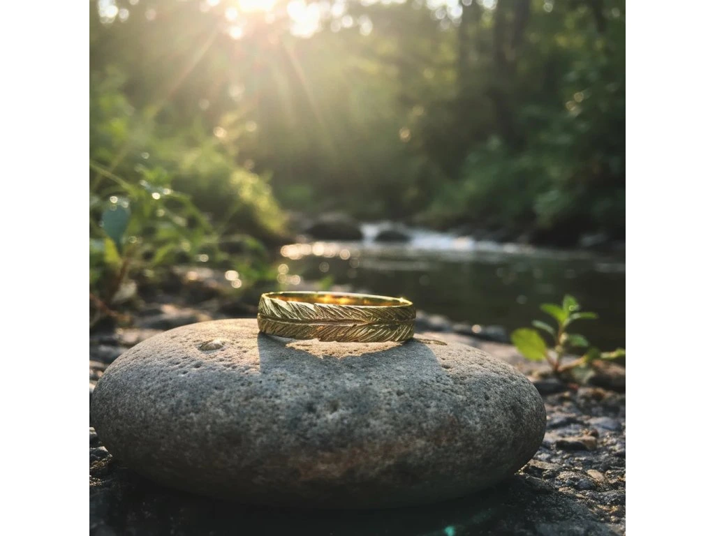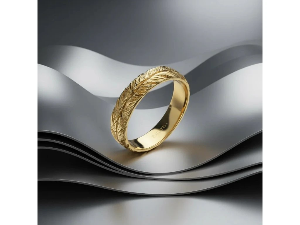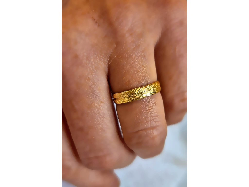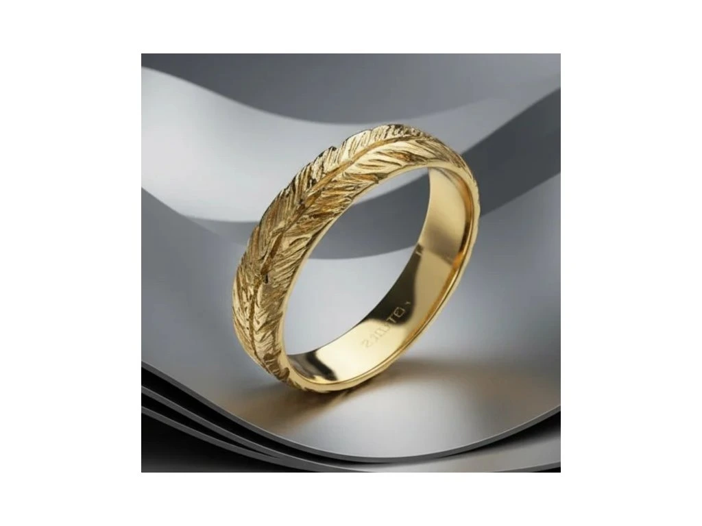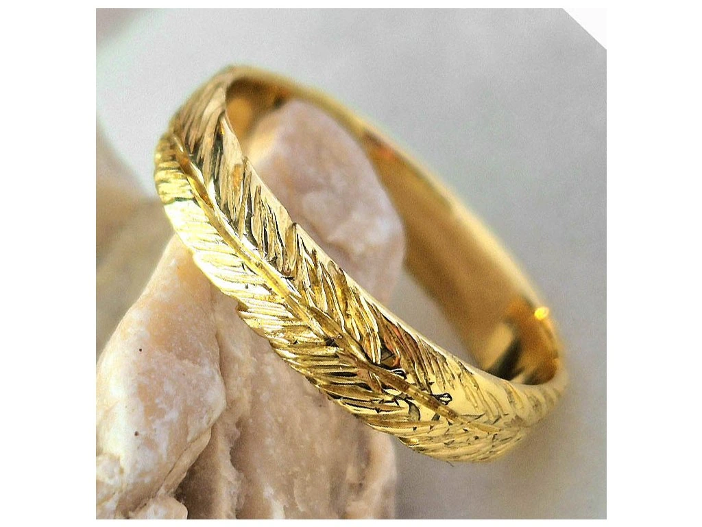 Dizajn: Ručne rytý vzor pierka pokrýva celý obvod obrúčky, čo jej dodáva prírodný a romantický vzhľad.