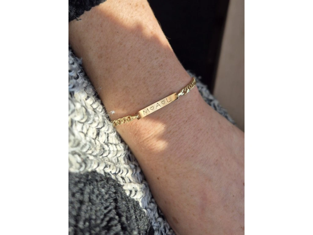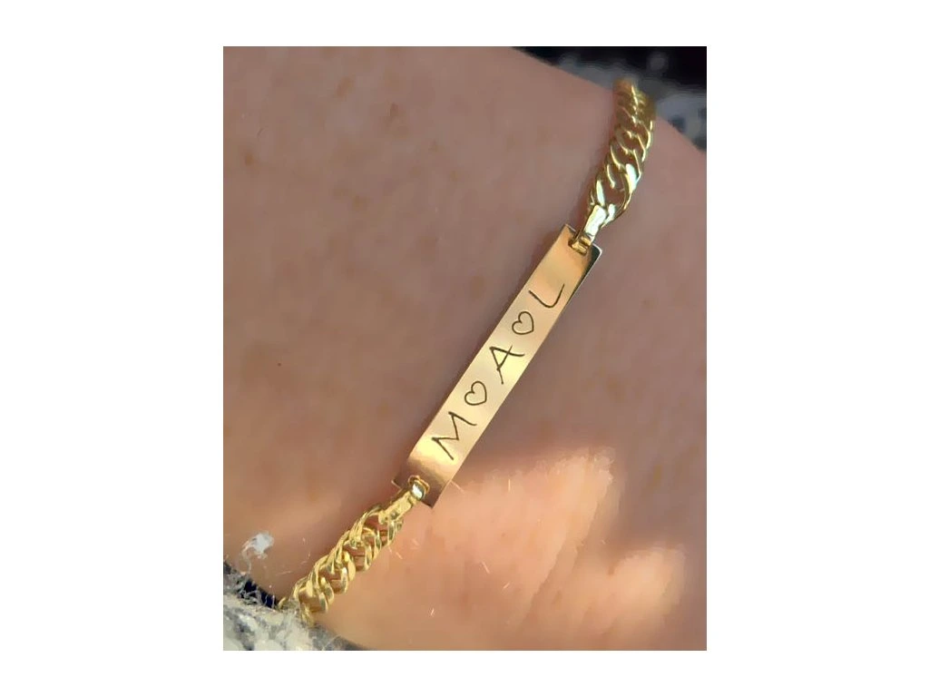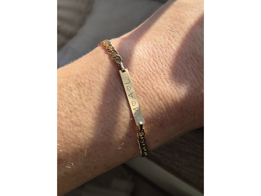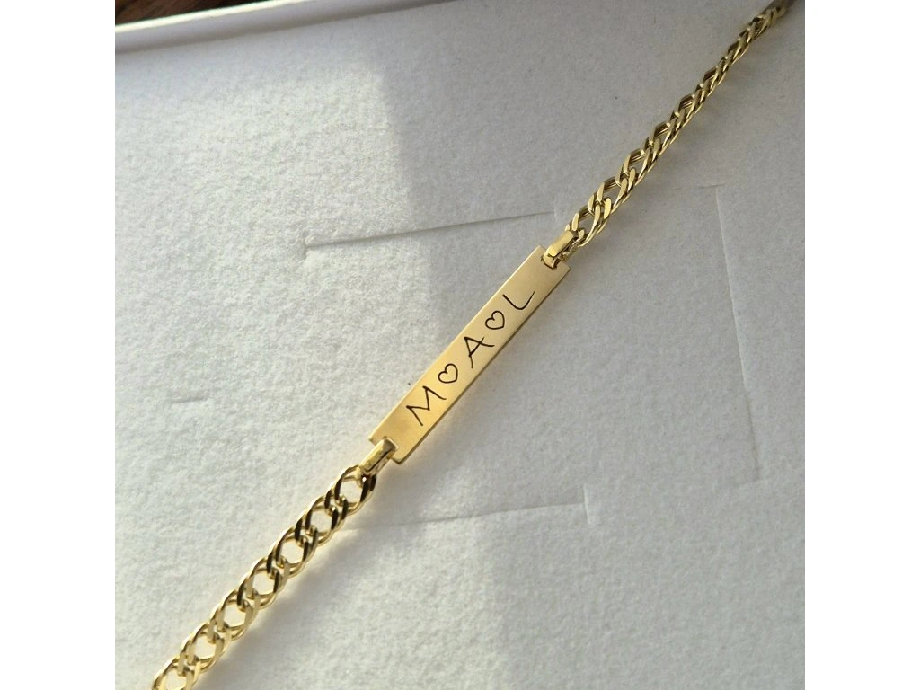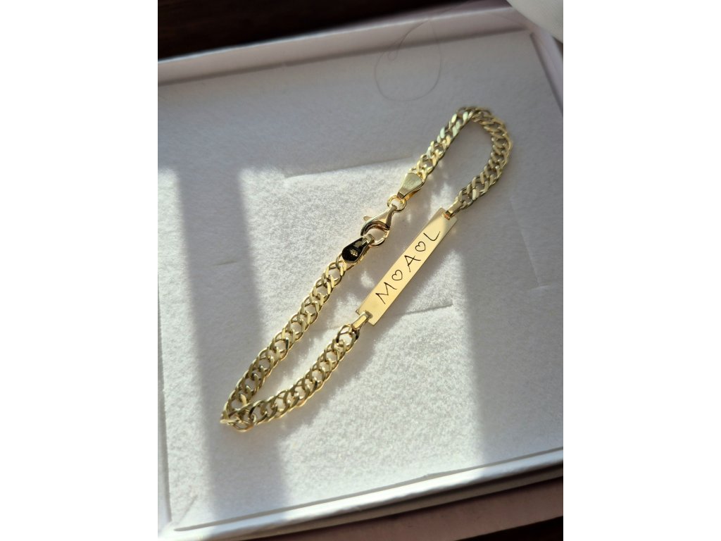 Zlatý náramok s platničkou na ktorú je možnosť gravírovať.
