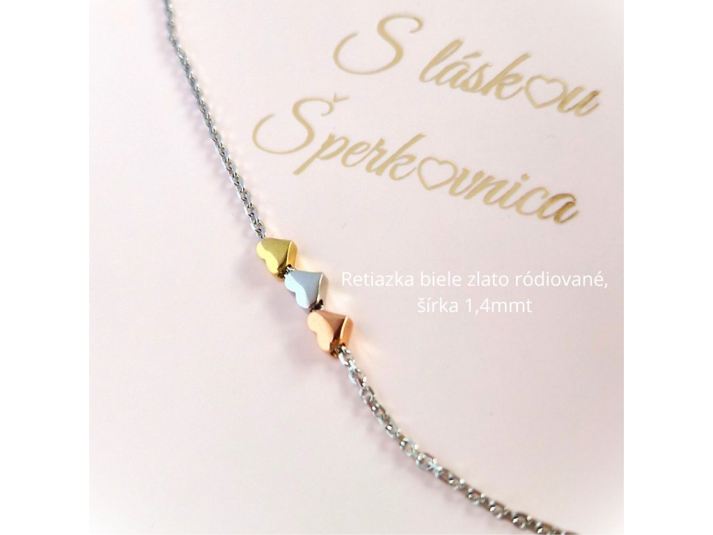 Na zlatej retiazke sú pohyblivé 3 srdiečka rôznej farby zlata.