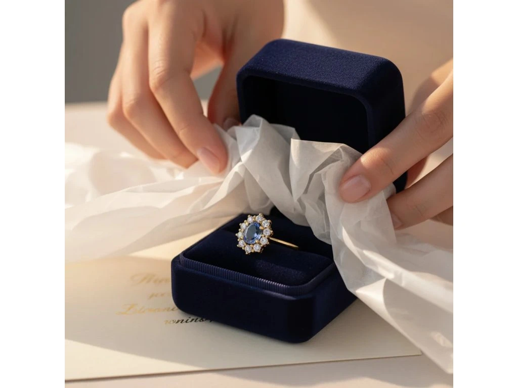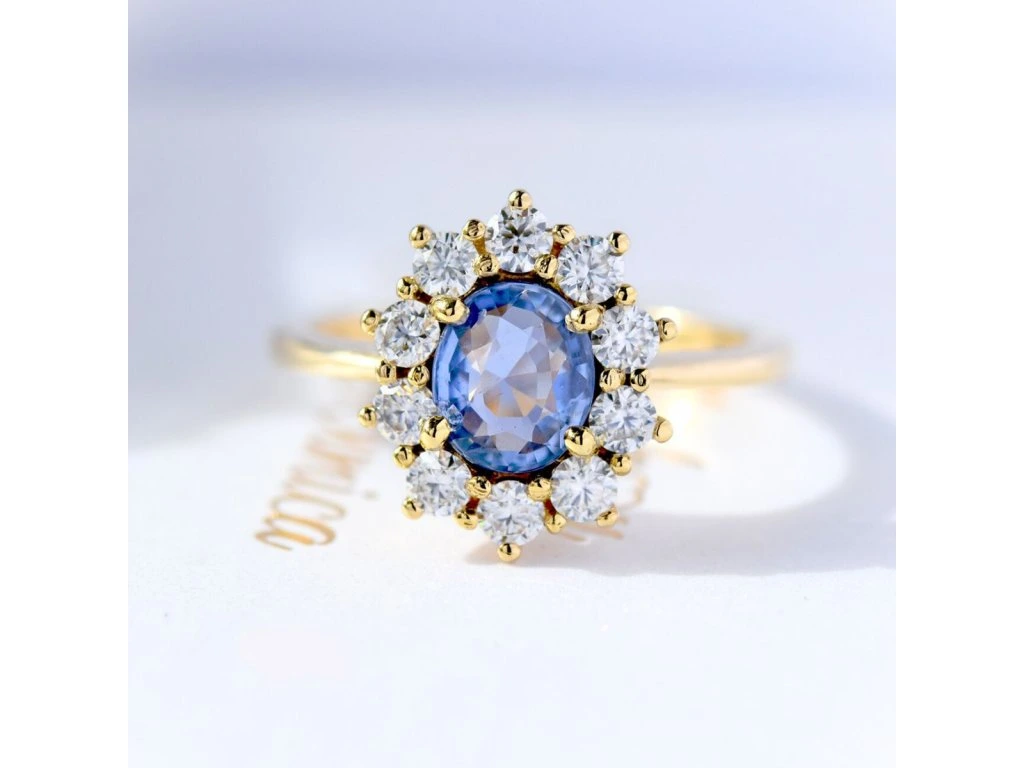 Zlatý prsteň s nebovo modrým zafírom a diamantami