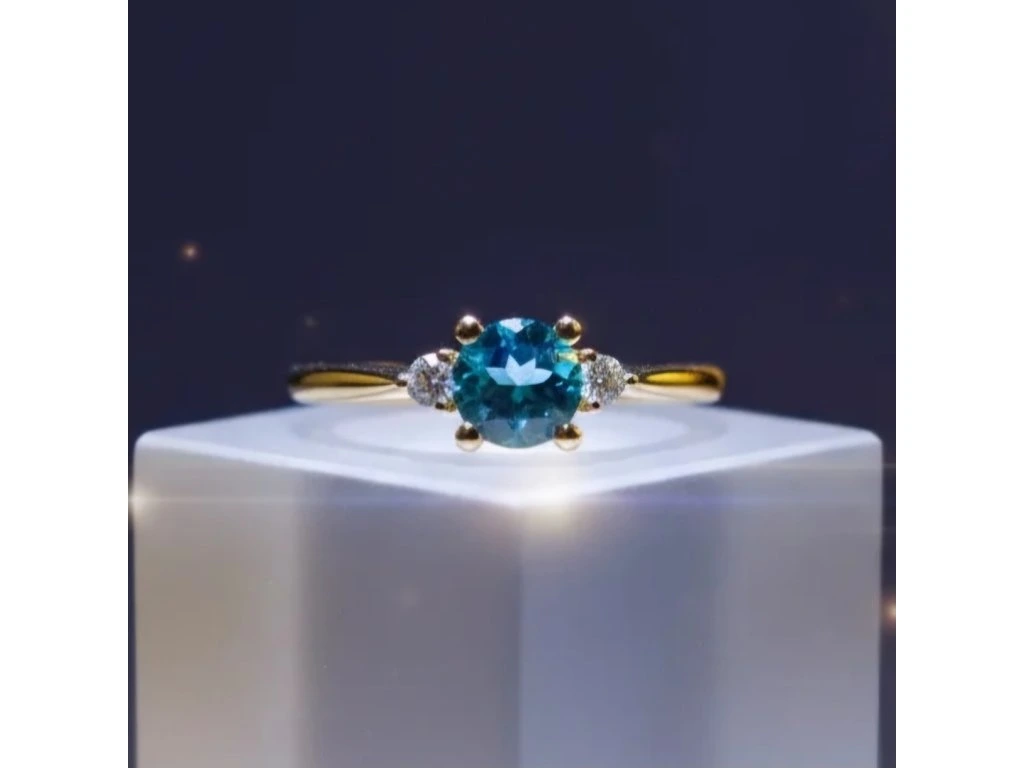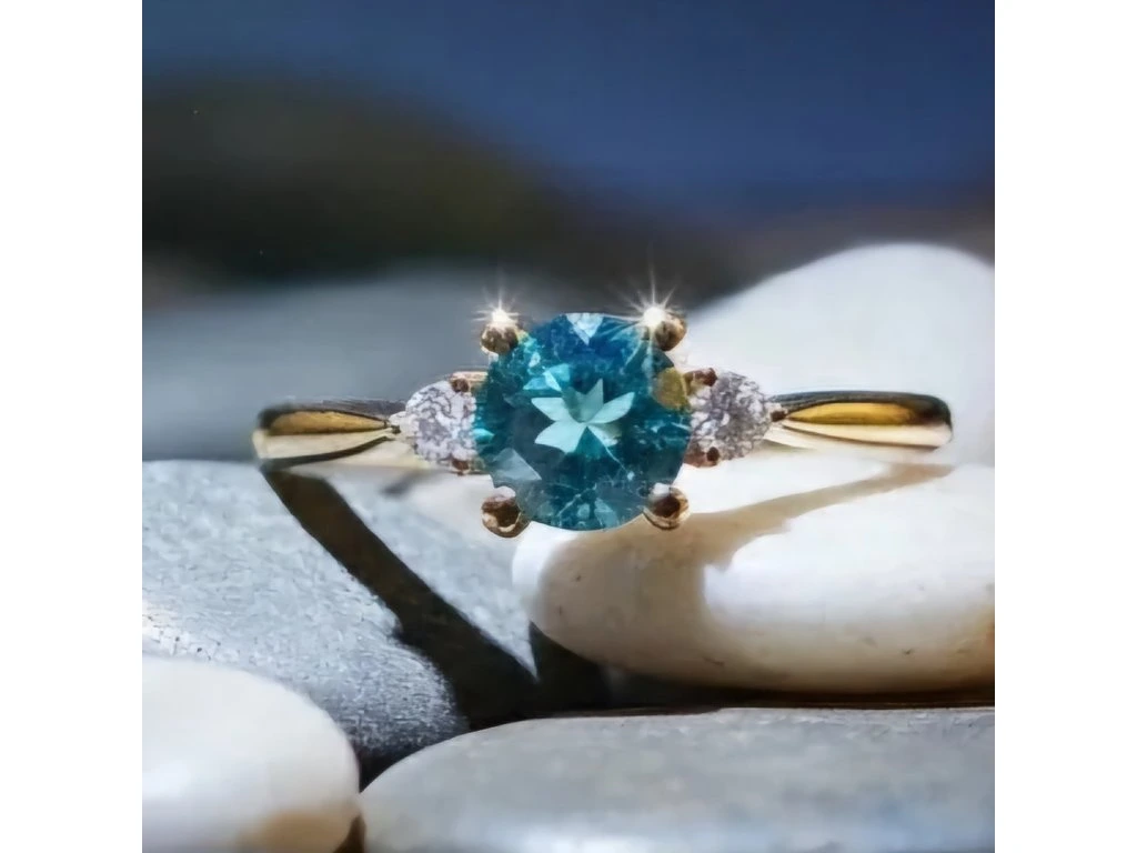 V centre prsteňa je 5mm veľký drahokam modrej farby - Topás, po stranách sú 2mm veľké drahokami zafír biely.