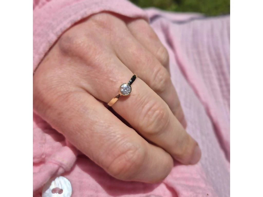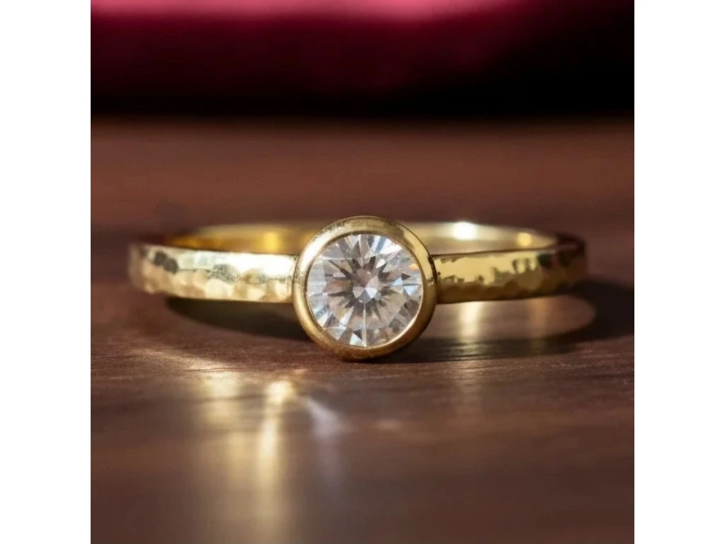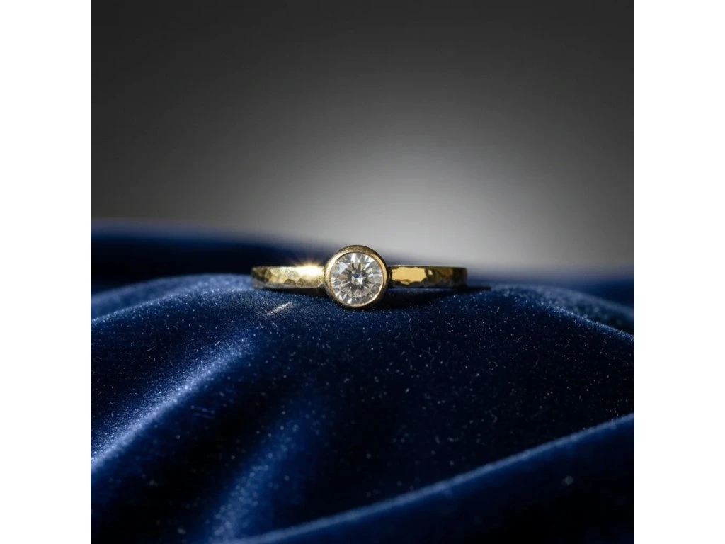 Zlatý tepaný prsteň s diamantom.