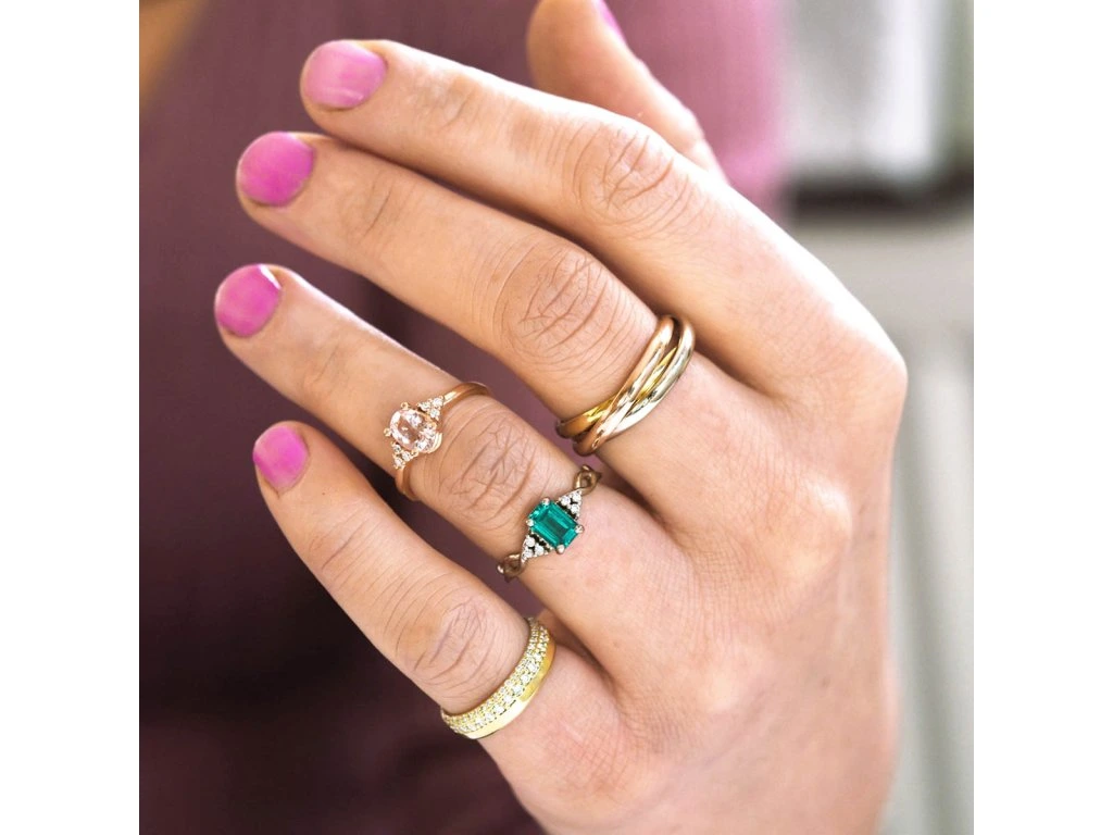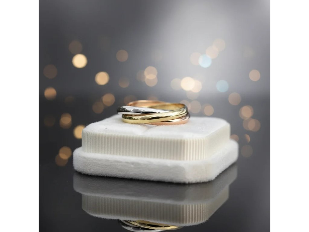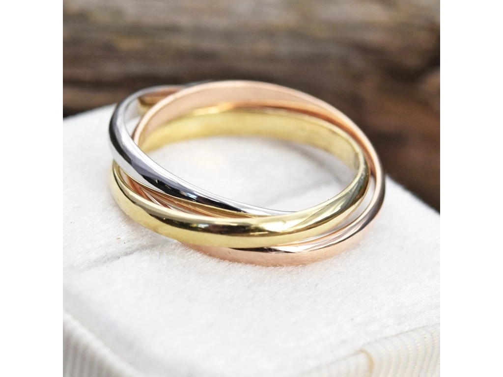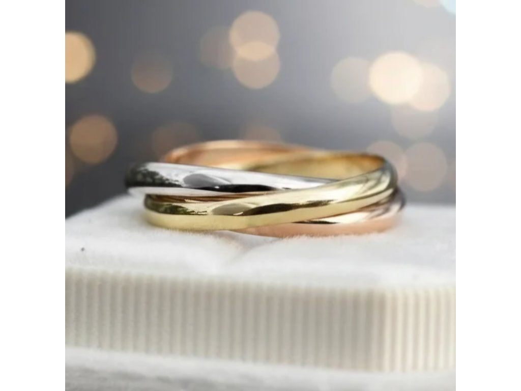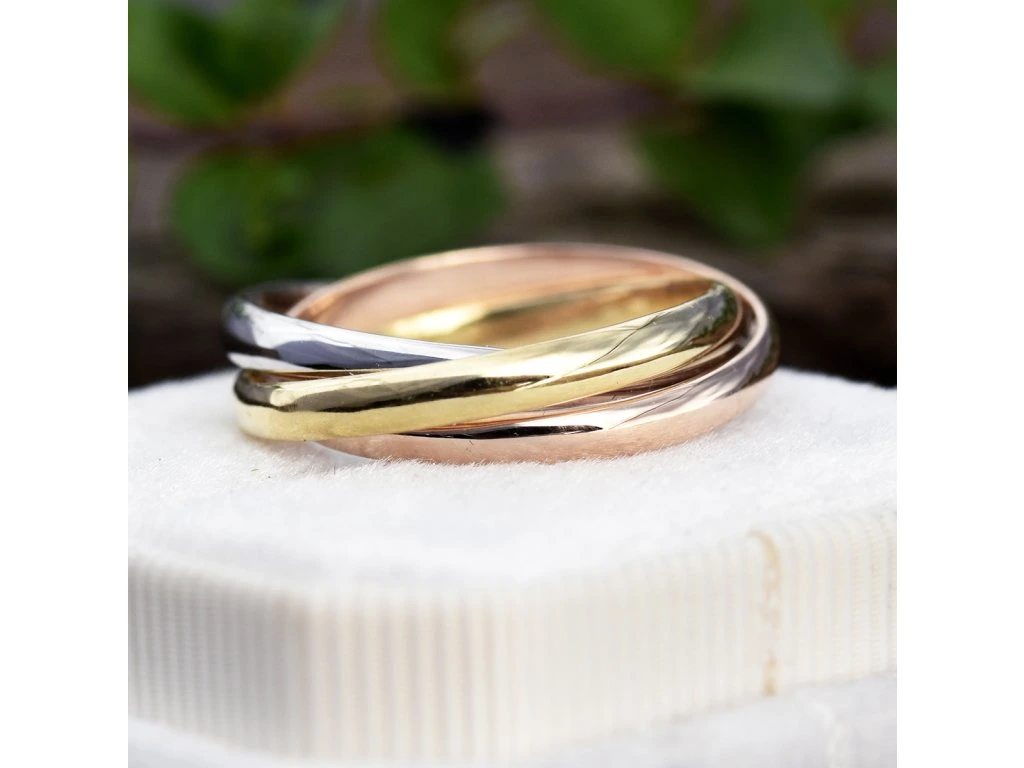 Zlatý prsteň tvorený tromi prstienkami v 3 farbách zlata. Prstienky sú navzájom prepletené a navzájom pohyblivé.